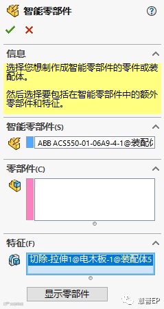 5、在菜单栏选择【工具】【制作智能零部件】,在属性面板选择ABB ACS550-01-06A9-4这个零件,特征选择“电木板”特征中的“切除-拉伸1”,点击“确定”,完成智能部件的制作,完成后的智能零件图标带有闪电标识。如图1-5所示。