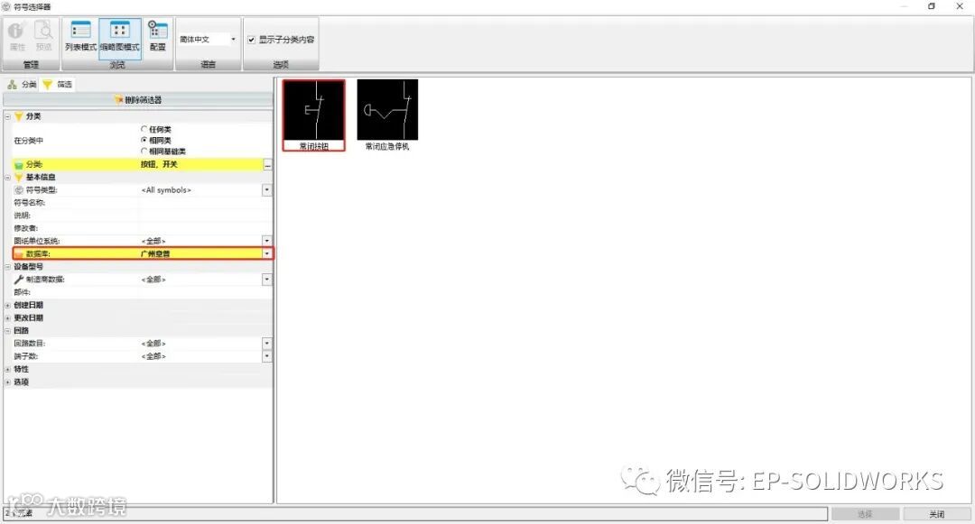 法二:在【符号选择器】,切换到【筛选】选项卡,在数据库的右侧下拉菜单选择自己企业的数据库,在右侧很容易地找到常闭按钮,在图纸的合适位置放置。