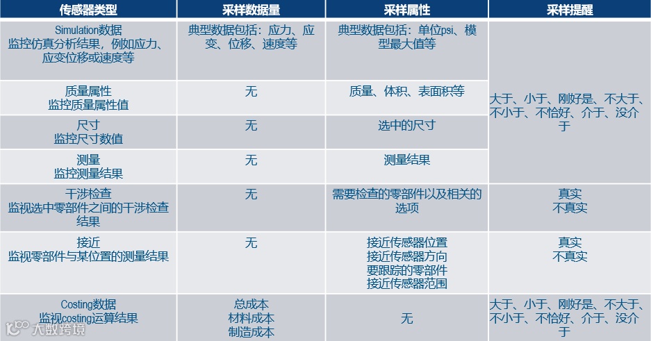 在SOLIDWORKS中,每个传感器类型都有特定的数据量或属性,如下表: