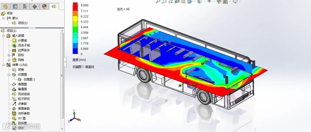 完成相关模型设计→加载Flow Simulation插件→设置分析单位→设定分析类型→设定流体介质→确定初始条件→指定分析目标→调整分析网格→运行计算→通过切面图查看对应截面上气体流动速度分布。
