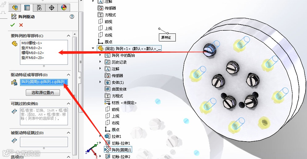 3、在“驱动特征或零部件”中单击,然后在设计树中选择阵列特征或在图形区域中选择一阵列实例的面。
