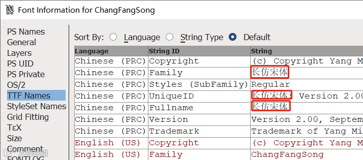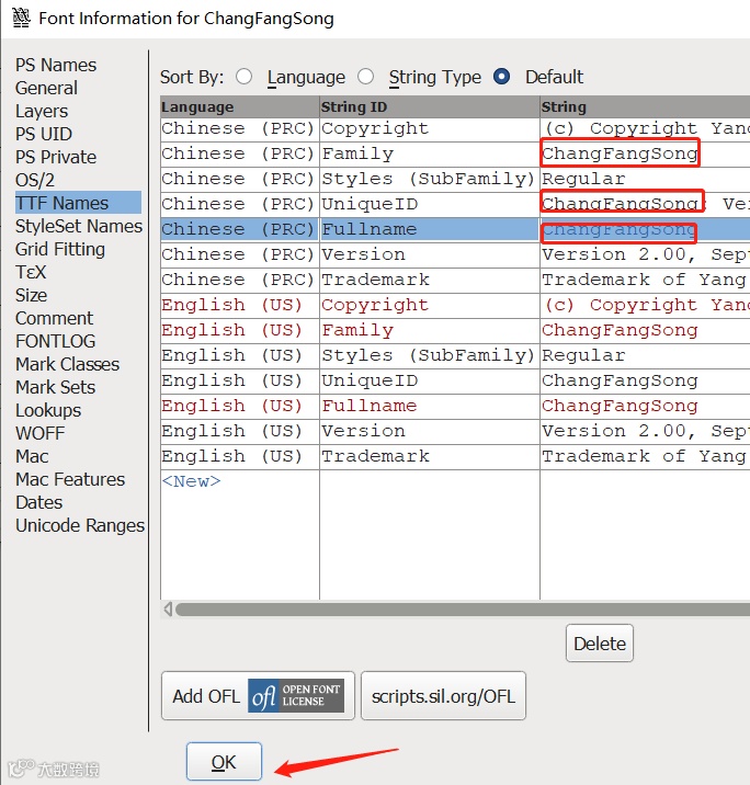 单击TTF Names,把该页面下的中文“长仿宋体”,如图7所示,全替换成上一步复制的“ChangFangSong”,并单击“OK”如图8所示。