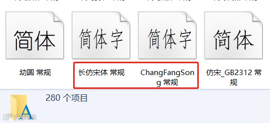 将新得到的字体“ChangFangSong.ttf”拖放到C:\Windows\Fonts下进行安装,会得到“两”个长仿宋字体,平常我们只需按习惯使用中文的“长仿宋体”即可,如图12所示