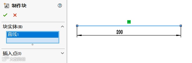 2. 还是在【布局】管理菜单下的命令,单击【制作块】命令选择一根线段,如图3所示,单击确定。