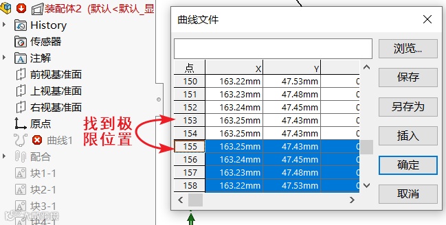 11. 系统会生成一个报错曲线,由于往复摆动导致部分数据重叠所致,我们编辑曲线,找到极限位置点后,后面数据删除即可,如图12所示。