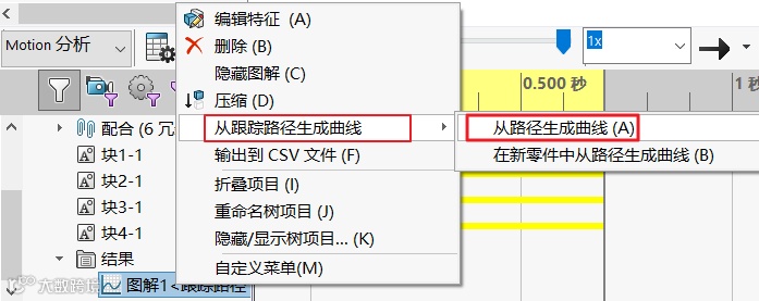 10. 展开motion分析下的【结果】,右击“图解1”,选择“从跟踪路径生成曲线”,“从路径生成曲线”,如图11所示。