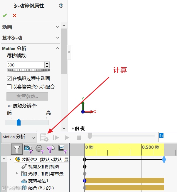 8. 运动算例属性下设置【motion分析】每秒帧数300,保证有足够数据生成曲线,最后点击运行即可,如图9所示。