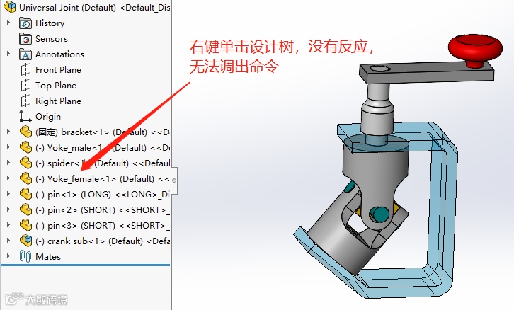 2、在2023 SP0.0版本中,进入零件或子装配体编辑环境,并更改它的透明度,这时在设计树单击鼠标右键或左键,无法调出菜单命令,如图1-2所示。在最新的2023 SP1.0版本中,已经修复了该问题。