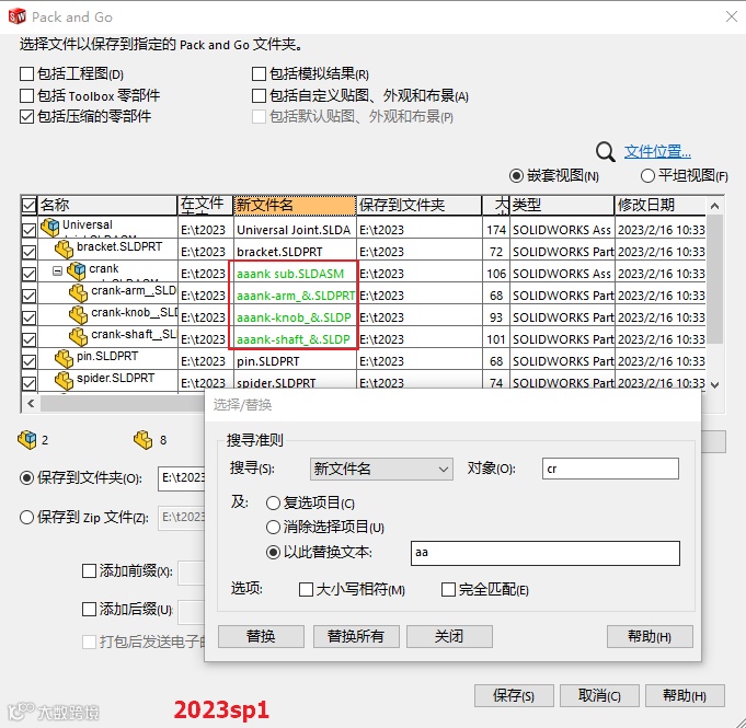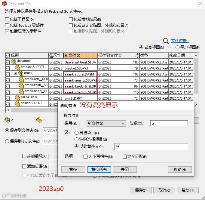 3、在2023 SP0.0版本中,使用【打包】功能,对某零件重命名,使用【以此替换文本】,替换后的文本没有高亮显示,如图1-3所示。在最新的2023 SP1.0版本中,已经修复了该问题,如图1-4所示。