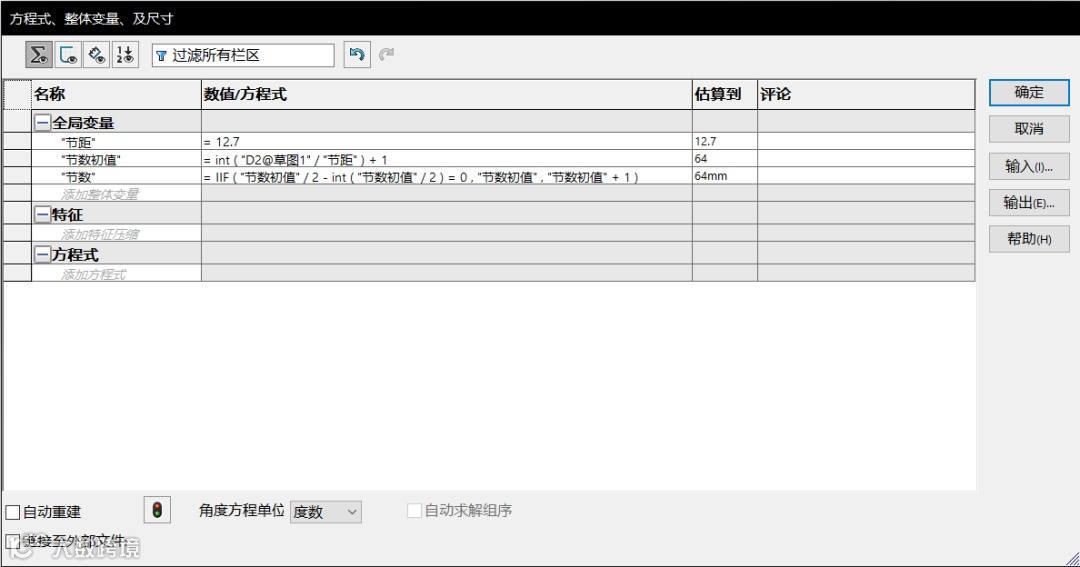 第三步:打开零件,并输入相关的方程式,按照前面一期视频的方法输入方程式,在公众号中以链条为关键字搜索往期视频,查看详细内容,这里不再过多重复;