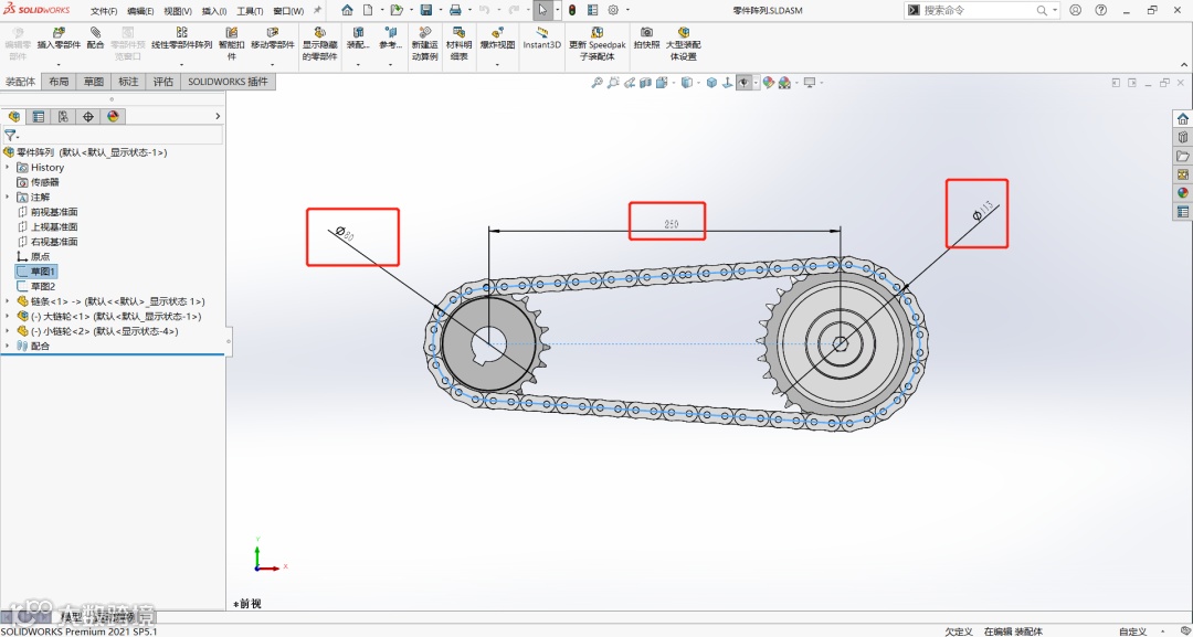 此时链条绘制完成,可在装配体中任意更改草图的三个尺寸,以达到修改中心距、修改两链轮大小的目的。