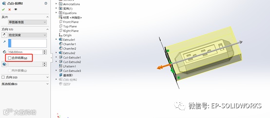 步骤二:建立覆盖第一个模型的一个矩形拉伸,去除勾选合并结果选项