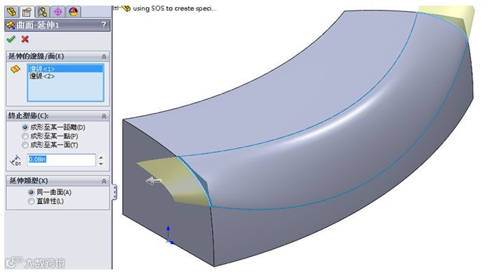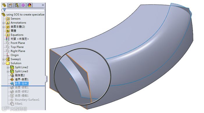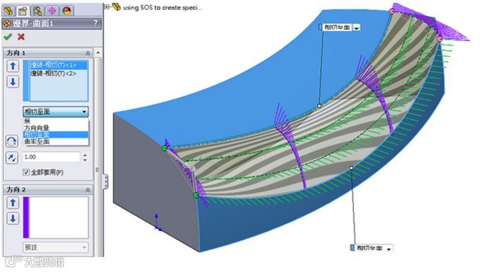 为了快速的将这个空洞的区域弥补起来,我们可以使用边界曲面,并点选上、下两条边线,作为这个曲面的起点及终点。而且,为了要让曲面的衔接能够Smooth的连接在一起,我们可以设置这两条边线的起始及终止条件,这里我们选择相切至面(图三)。软件自动帮助我们计算两个相连的面有一个相切的效果。