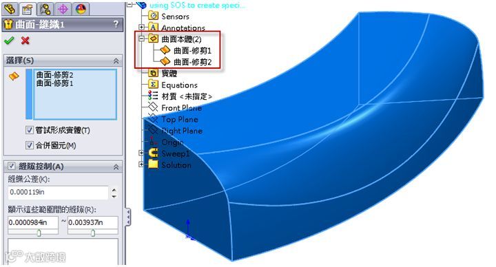 最后,原本的零件因为删除面的动作,变成了一个曲面而非实体。为了要让它再次成为实体。我们将刚刚所完成的曲面与他做一个缝织的动作。点选缝织曲面功能。将原本实体的面及刚刚绘制完成的曲面选择起来。因为这两个面可以形成一个密闭的实体。我们可以勾选『合并像素』、『尝试形成实体』(图八), 让它成为一个实体而不再是曲面。