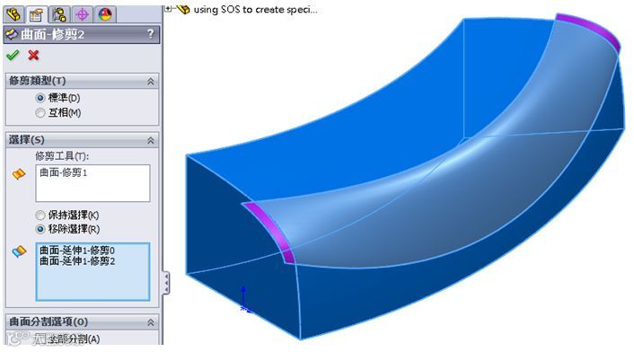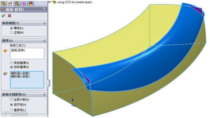有了修剪工具,我们就可以使用修剪曲面,将刚刚延伸的曲面做为修剪工具,并选择『移除选择』将不需要的面点选起来(图六)。点选确定后就完成了。同样的道理,我们再做一次修剪曲面,将刚刚延伸的曲面也删除(图七)。