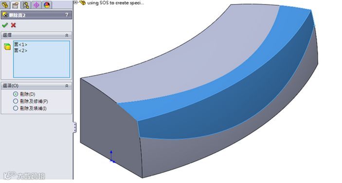 如果要运用曲面的功能来完成的话,第一件要做的事,就是利用删除面的功能,将不必的面删除。如图我们点选曲面工具的删除面,将上转角的两个面删除(图二)。