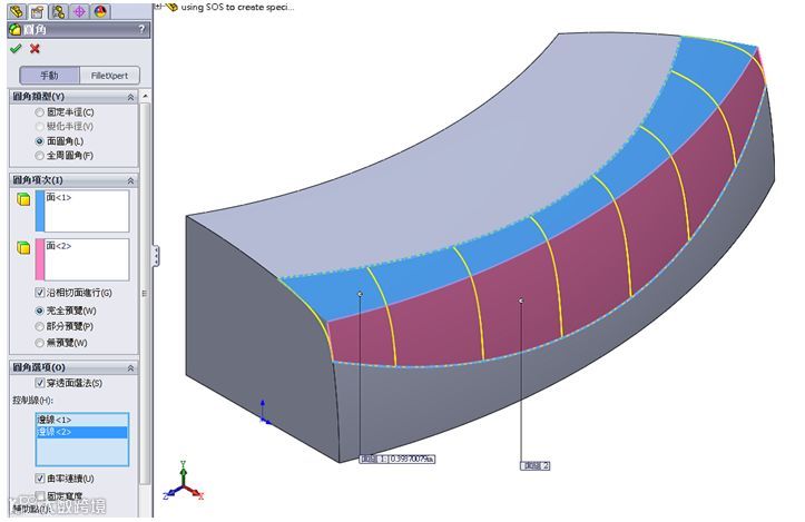 我们可以直接在画面上方的Commnd Manager点选圆角的指令。圆角的类型选择面圆角。圆角项次的部份我们点选因为分割线所产生的两个面,有几个选项要特别注意,为了要让曲面跟曲面的衔接能够Smooth,请记得勾选『沿相切面进行』。圆角选项的部分可以看到控制线的选项,我们利用这两条分割线作为我们的控制线。并将曲率联机勾选起来,做出来的结果才会符合我们的预期(图九)。