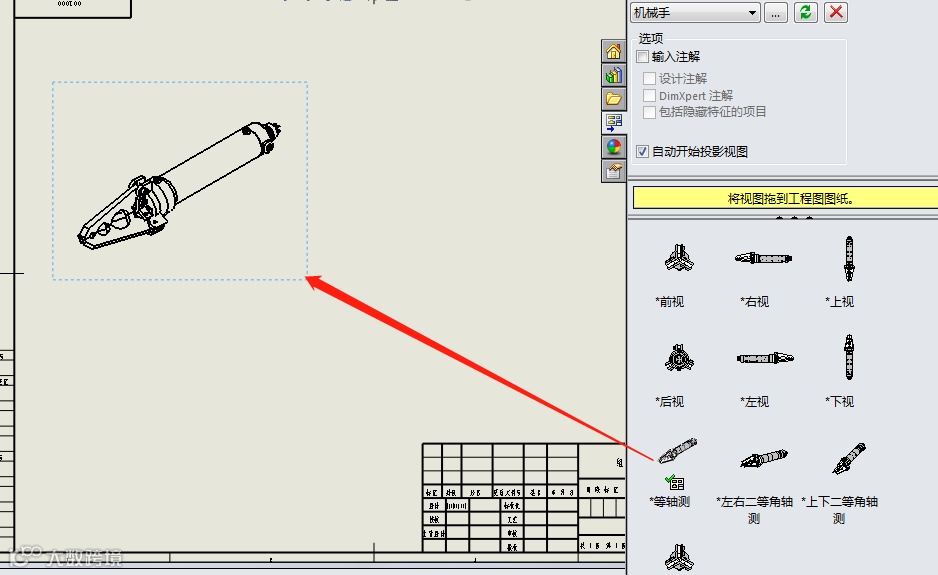 1、通过视图调色板(或者模型视图命令)添加装配体视图到工程图视图上,如下图: