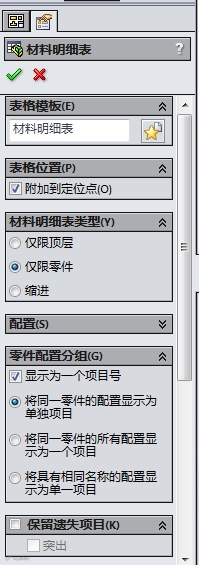 • 在“零件配置分组”选中【显示为一个项目号】,【将同一零件的配置显示为单独项目】;