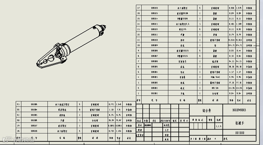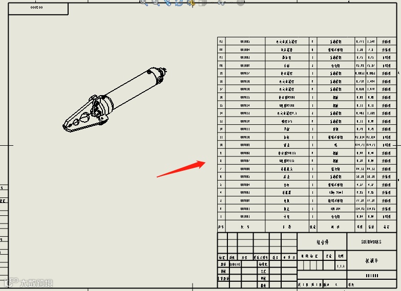 SOLIDWORKS材料明细表(BOM表)功能比较强大,可直接在工程图内生成材料明细表,并且自动填写表格的内容,包括序号、代号、名称、数量、材料、重量、备注等信息(如下图),并且可以根据零件序号顺序自动调整表格内的上下顺序。