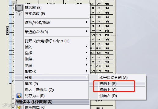 4、如果材料明细表超过图幅,可以将材料明细表分割成多个,方法是在要分割的位置右键,选择【分割】==》【横向下】或者【横向下】,如下图: