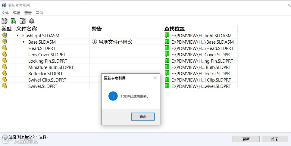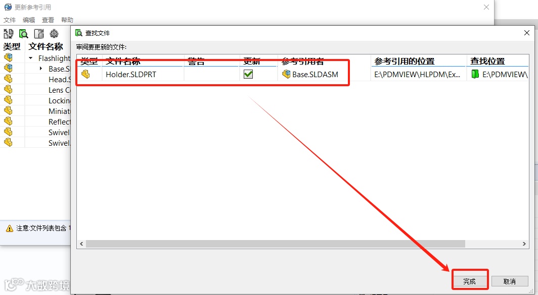 5、在完成所有必要的参考文件搜索和替换后,仔细检查更新列表,确保所有选定的零部件都已正确关联到新的参考文件。点击“完成”或“应用”按钮,保存更改并关闭“更新参考引用”向导。