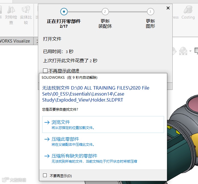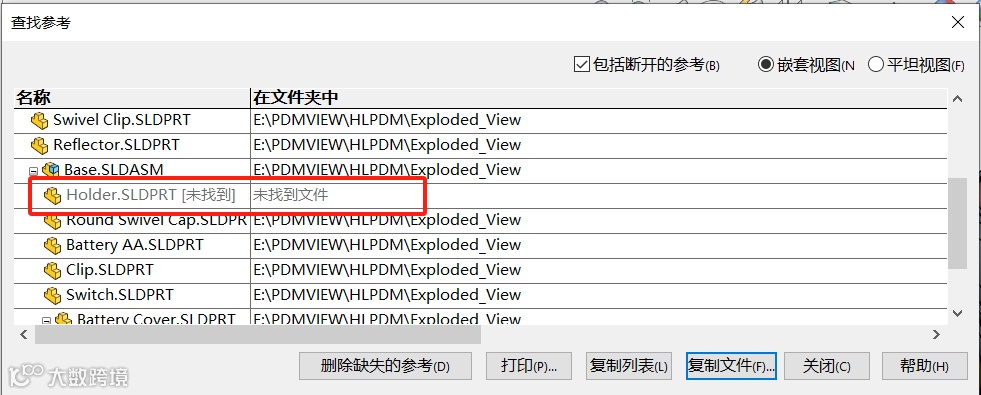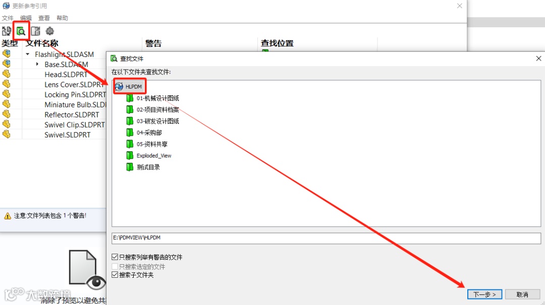 如果在搜索过程中发现缺失的文件(即文件未找到),系统会在警告区域显示相关信息。对于这些缺失的文件,需要手动找到它们(可能是在PDM库的其他位置,或者是在外部存储中),然后再次尝试更新参考引用。