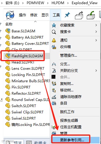 2、选择顶层装配体,找到并点击“工具”菜单下的“更新参考引用”选项: