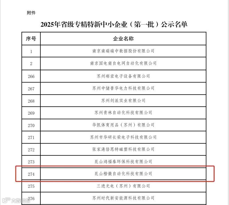 近日,江苏省工业和信息化厅正式公布2025年度省级“专精特新”中小企业(第一批)名单,昆山楷徽自动化科技有限公司成功入选。这一荣誉不仅是对楷徽过往成绩的高度肯定,更是对企业未来发展的有力鞭策,标志着楷徽在专业化、精细化、特色化、新颖化的发展道路上迈出了坚实而关键的一步!