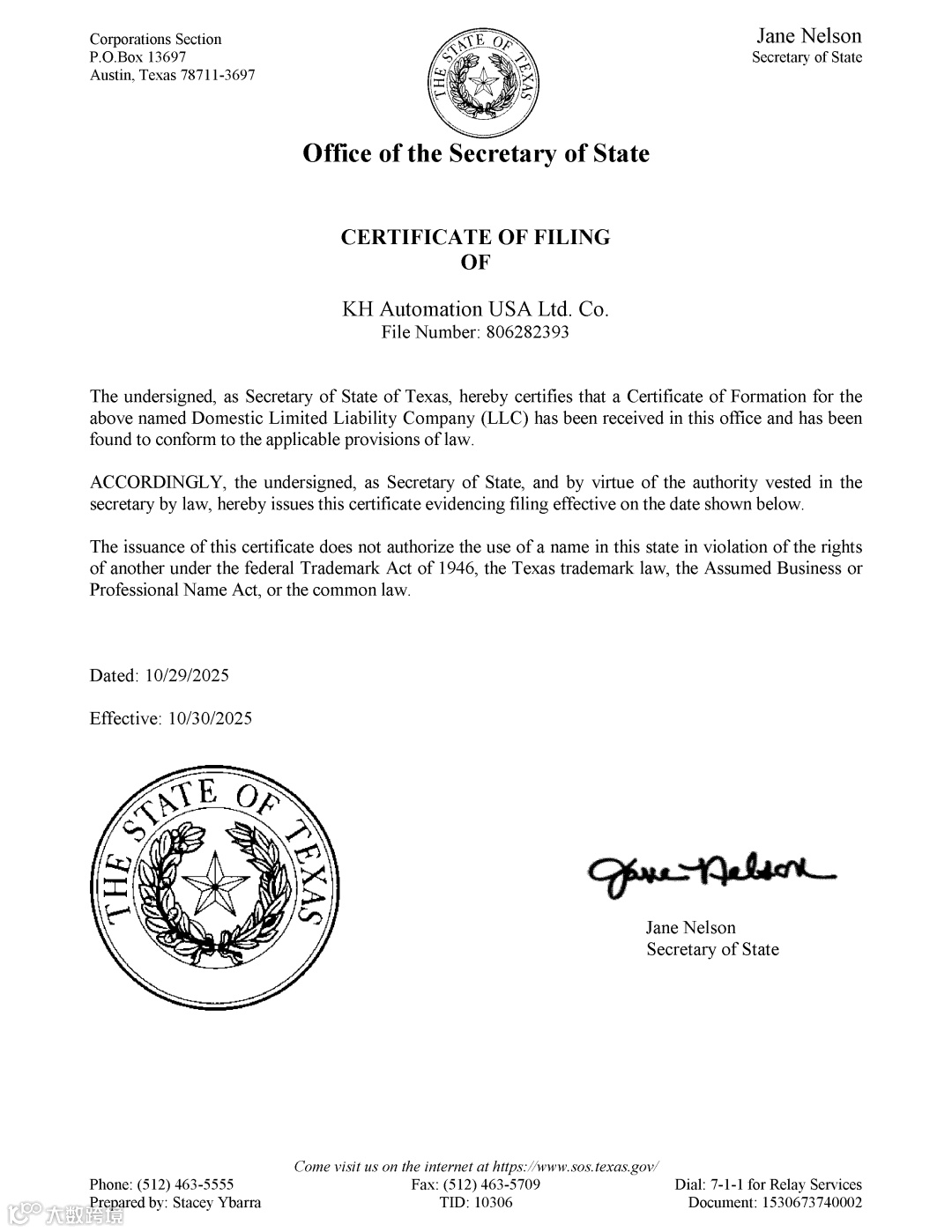近日,楷徽集团迎来重要里程碑 —— 经美国德克萨斯州州务卿办公室审核,KH Automation USA Ltd.Co.(以下简称 “KH US 公司”)符合当地法律规定,正式完成备案登记,标志着 KH US 公司在美运营资质获得官方认可,开启业务发展新篇章。