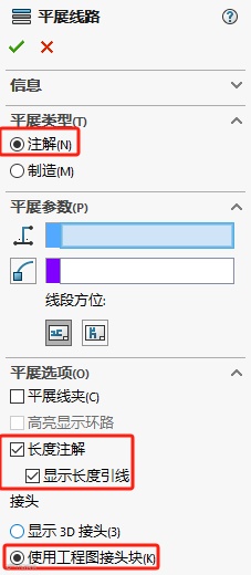打开名称为”Electrical_Drawing_Lab”的装配体,使用线路装配体“Harness1-Signal control system_di”创建注解平展,在【平展选项】勾选【长度注解】【显示长度引线】,接头为【使用工程图接头块】。