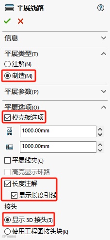 使用装配体“Assem2”创建制造平展,勾选【模壳板选项】【长度注解】【显示长度引线】【显示3D接头】,不勾选【工程图选项】。