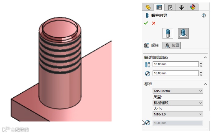 对于在圆柱体或曲面上创建的螺柱,软件支持此功能。在早期版本中,螺纹直径必须小于轴直径。