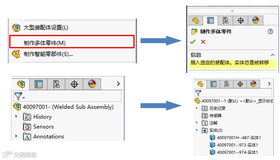 要创建多实体零件,请在装配体中单击工具>制作多实体零件。