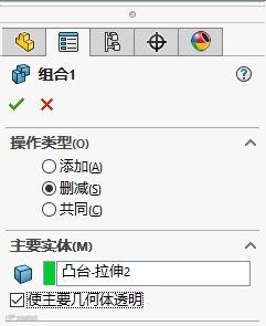 单击插入> 特征> 组合。在PropertyManager中的操作类型下,选择删减,然后在主要实体下选择使主要实体透明。