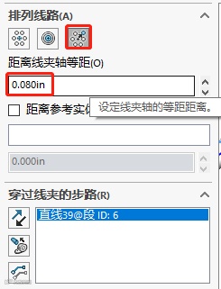 放大线夹,观察线路穿过了线夹的轴线,也可以对线夹的位置进行调整,点击排列线路中的【手动等距线路】,此处输入0.08,可根据实际情况调整,点击【确定】,如图11、12、13所示。