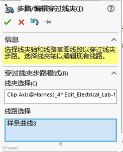 点击【自动步路】,步路模式选择【重新步路样条线或直线】,单击选择线夹的轴线和电线路径,从绘图区预览显示电线穿过了线夹,点击【确定】,关闭自动步路命令窗口,如图7所示。