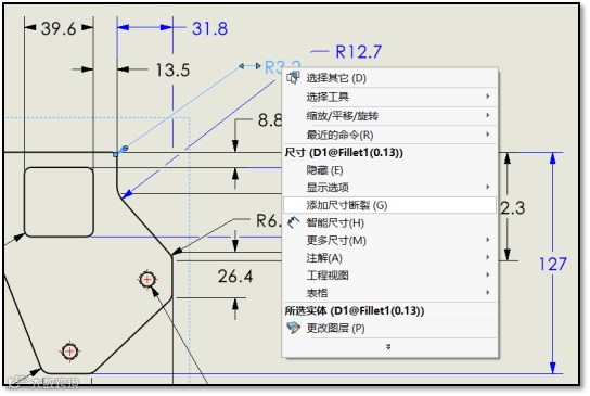 客户的工程图包含大量尺寸及注释,相互干涉遮挡以致难以看清,甚至导致制造错误。为了帮助解决这一问题,SOLIDWORKS 2026在尺寸线相交和重叠文本的地方添加尺寸断裂,即使添加或修改,移动等操作只点击尺寸右键更新尺寸断裂即可,此增强功能提高了复杂图纸的清晰度和可读性,以避免混淆和误解。