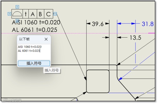 在几何公差框格中输入任何数字、字母或符号的组合,如:角度度数,分 (') 和秒(")以及字母文本等各类符号,并且在特征控制框四周添加第二文本框,详细注释几何公差要求,此增强功能为用户在更复杂的使用场景中指定几何公差提供了额外的灵活性。