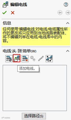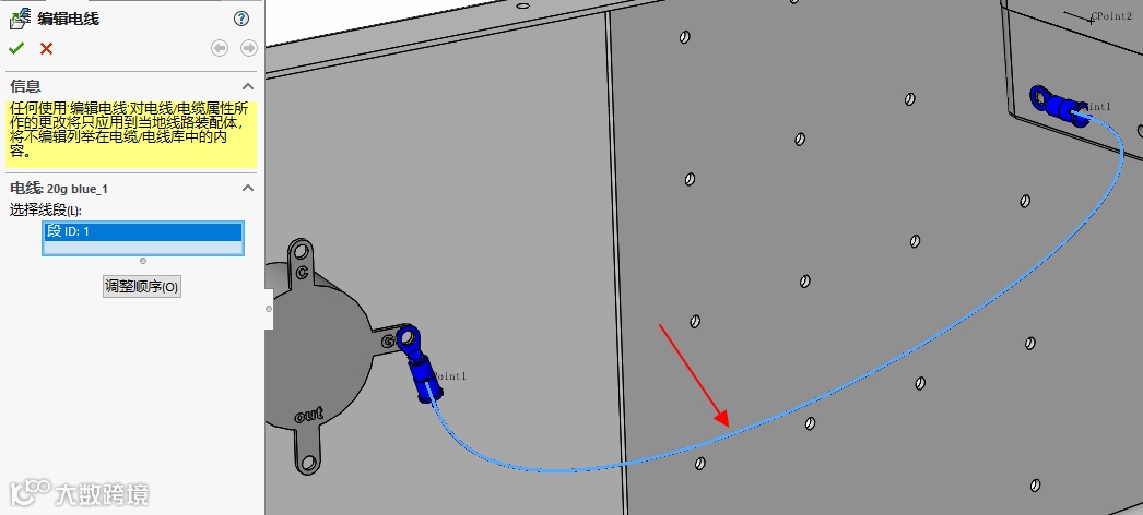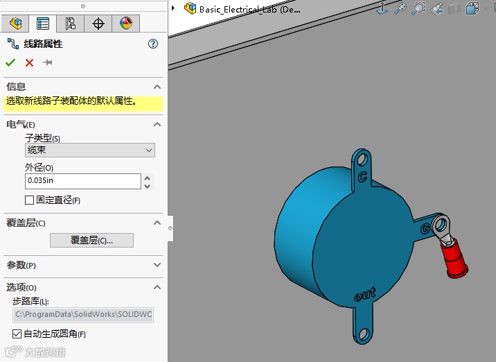 点击【选择路径】,选择连接两端子的样条曲线,点击【确定】,退出3D草图环境,再退出装配体编辑环境,这样就创建了一条包含接头的电线。如