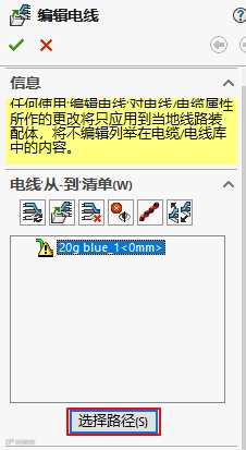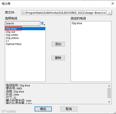 接下来,分配电线型号。点击【编辑电线】,【添加电线】。从电力库中选择20g blue,点击【确定】。