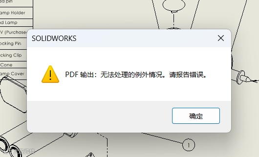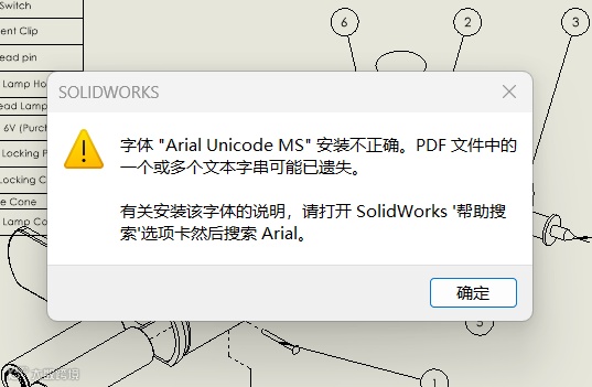 在使用SOLIDWORKS过程中,将工程图另存为PDF,若工程图中包含非英文字符(如中文、日文、特殊符号等),且未安装Arial Unicode MS字体则可能会出现“字体‘Arial Unicode MS’安装不正确。PDF 文件中的一个或多个文本字串可能已遗失。”的警告如下图,点击确认后还会出现另一个提示窗口“PDF 输出:无法处理的例外情况。请报告错误。”这将预示着将会导致PDF中部分文本内容丢失的情况。
