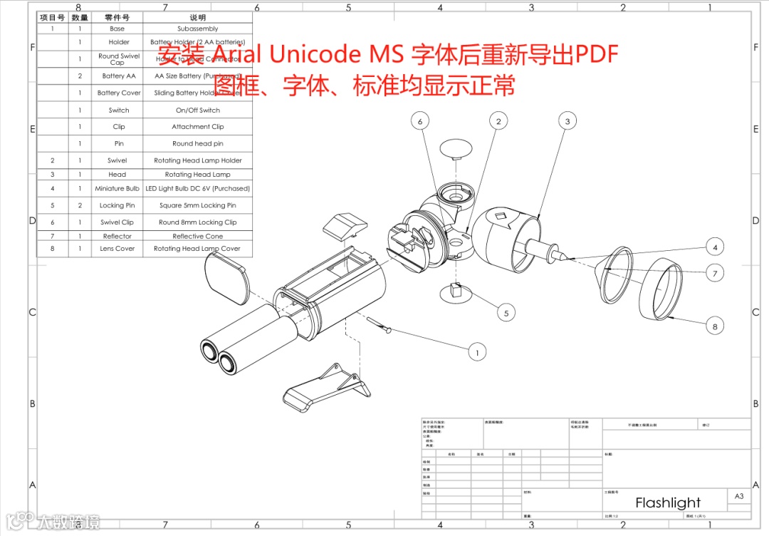 注意:若无法获取Arial Unicode MS字体,可在SOLIDWORKS工程图中改用系统已安装的Unicode字体(如微软雅黑、SimSun、Meiryo等)。