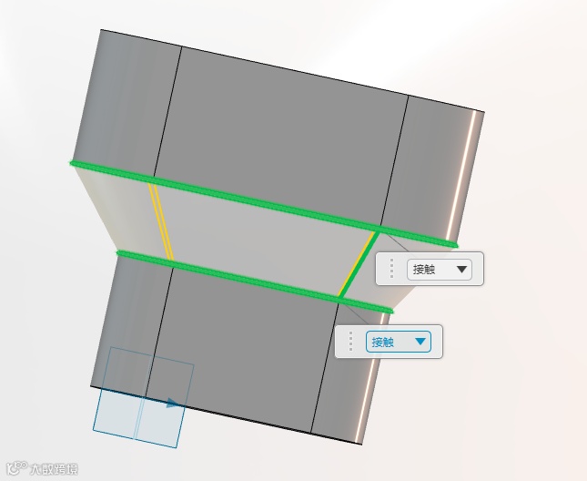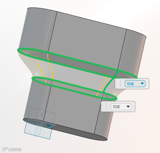 我们打算在两个实体的中间处,采用放样的方式将它们连接,传统方式我们采用依次选择各条边线来实现放样,但是如果模型复杂一些就会导致选择的边线过多,显得设计过程过于繁琐。如图: