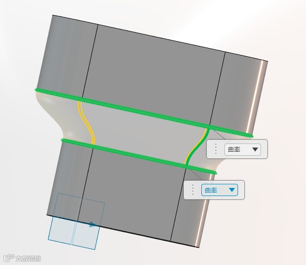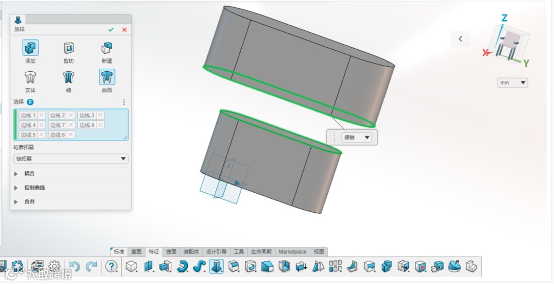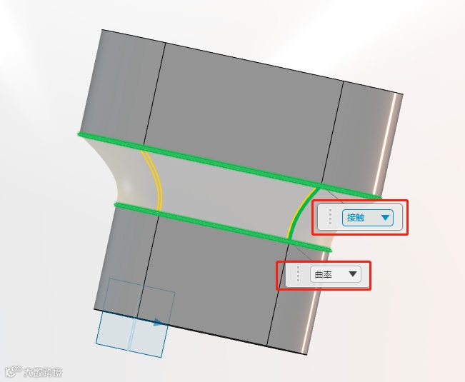 如果我们想要更改放样特征的外形的话也是非常方便的,X-Design为用户提供了多种外形方式,如切线、接触、曲率,每一种都有不同的放样效果,如图:
