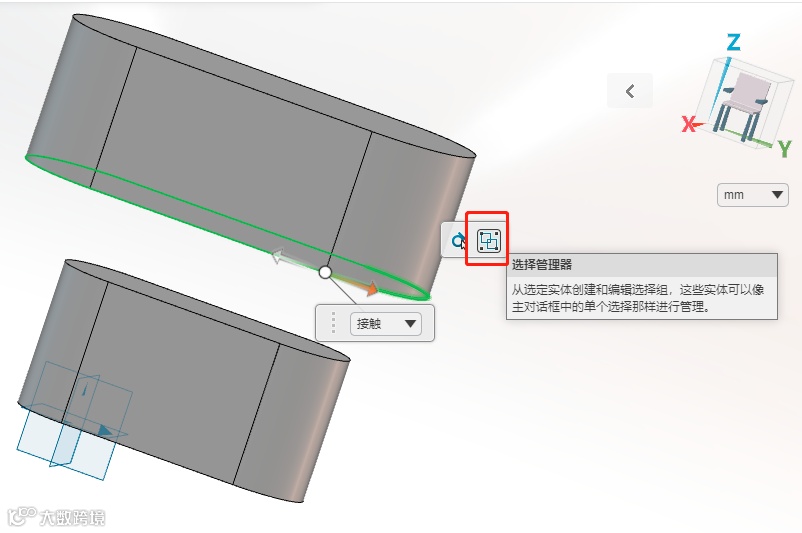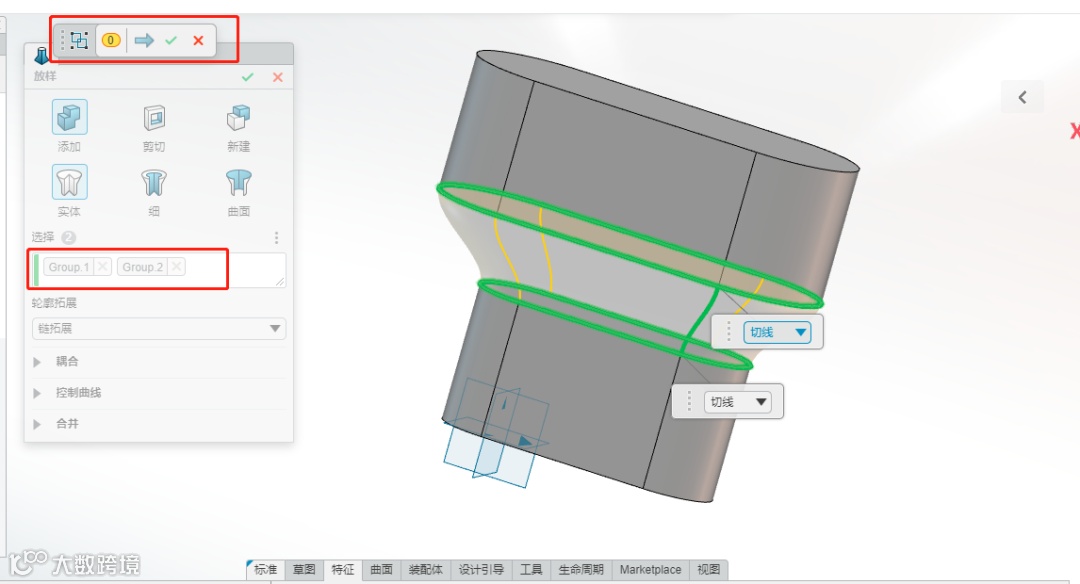 完成上述步骤后,下面是本例中关键的部分:点击【选择管理器】之后,左边的选项窗口中就会提示你选择一条边线,选择好一条边线之后就点击弹出的相切,即可自动选择闭合轮廓的所有边线,接下来就选择左边小窗口的【下一步】,然后就选择第二个放样轮廓。完成后打钩,这样两个放样轮廓的边线就自动分为两组,如果在之后的设计变更中需要更改轮廓就只需要删除整个组就可以,这个步骤非常的方便。详图如下: