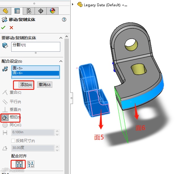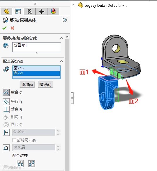 5、将较小的零件“分割1”作为要移动的实体,使用【重合】将实体进行定位,点击【添加】则继续添加配合。