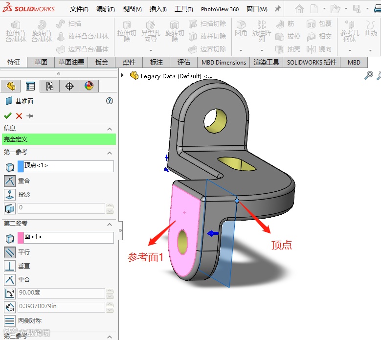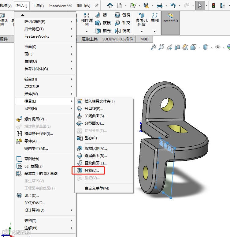 2、切除平面:首先定义一个基准面,我们将通过这个基准面对该实体进行分割,同时该基准面将作为【分割】命令的切除工具。