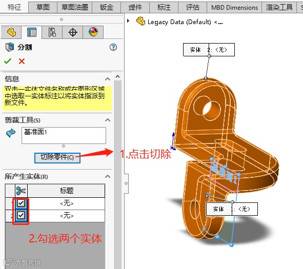 下一步在执行【分割】命令过程中,选择基准面1为剪裁工具后,需要点击切除零件,之后还需勾选产生的两个实体,再点击确定。