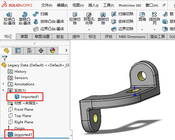 1、首先在SOLIDWORKS中导入中间格式的三维模型,在这个打开的模型中,现在是无法对它进行修改的,因为该模型为一个实体。